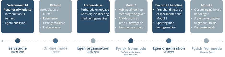 Forløbet starter med en digital introduktion via vores læringsplatform. Her får du adgang til e-learning, artikler og refleksionsopgaver, som giver dig et solidt fundament for at forstå de grundlæggende begreber inden for regenerativ ledelse. Du introduceres til centrale temaer og får mulighed for at reflektere over din egen ledelsespraksis og formulere mulige prøvehandlinger.